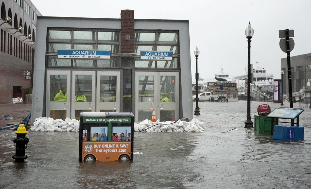Sandbags hold back water at the entrance to the Aquarium MBTA station during the March 2 nor’easter. Photo by Robin Lubbock for WBUR