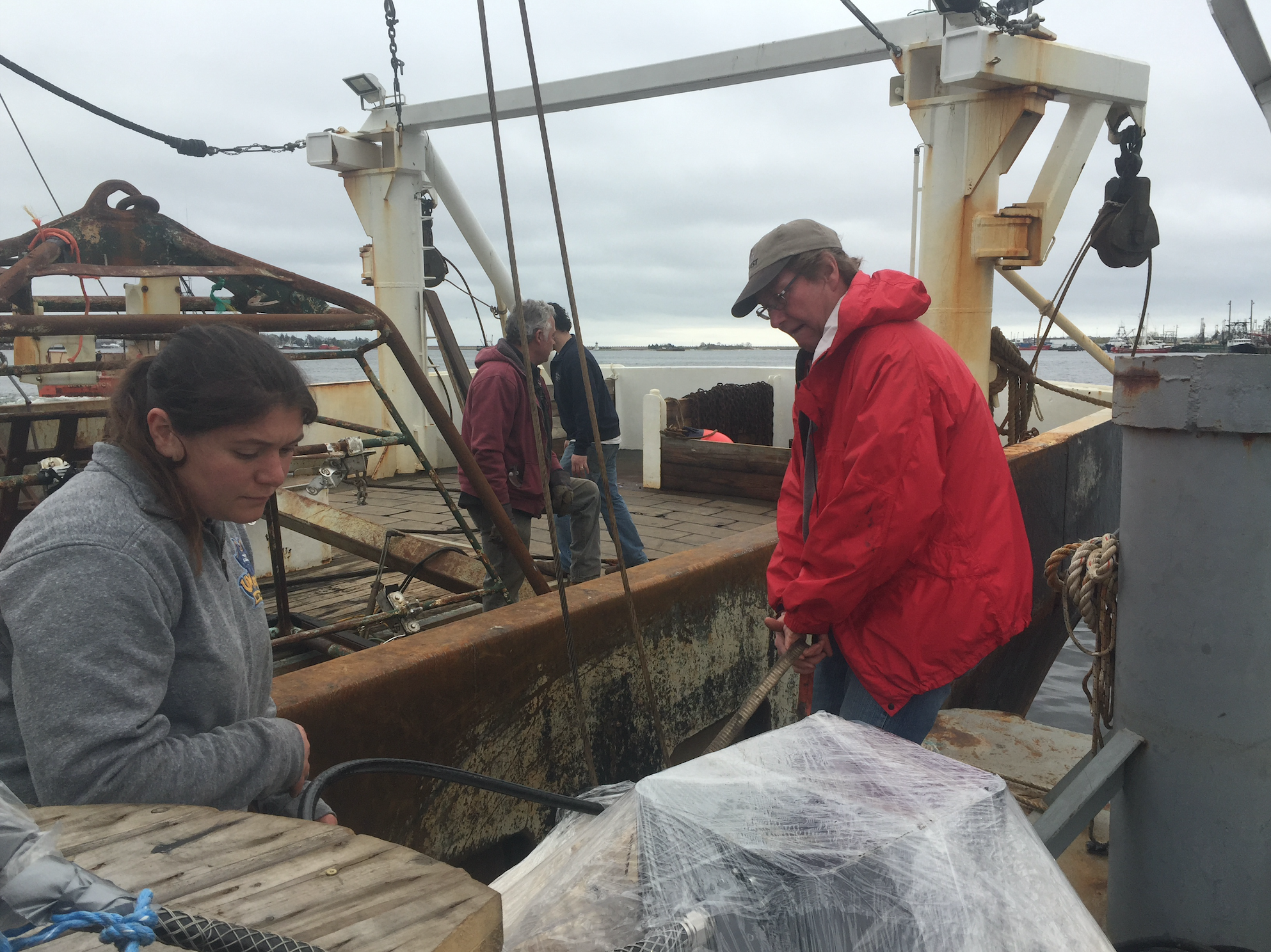 Dr. Kevin Stokebury, right, and his team on boat Liberty preparing for the last sea scallop survey before Vineyard Wind begins construction. Photo by Nadine Sebai for The Public’s Radio