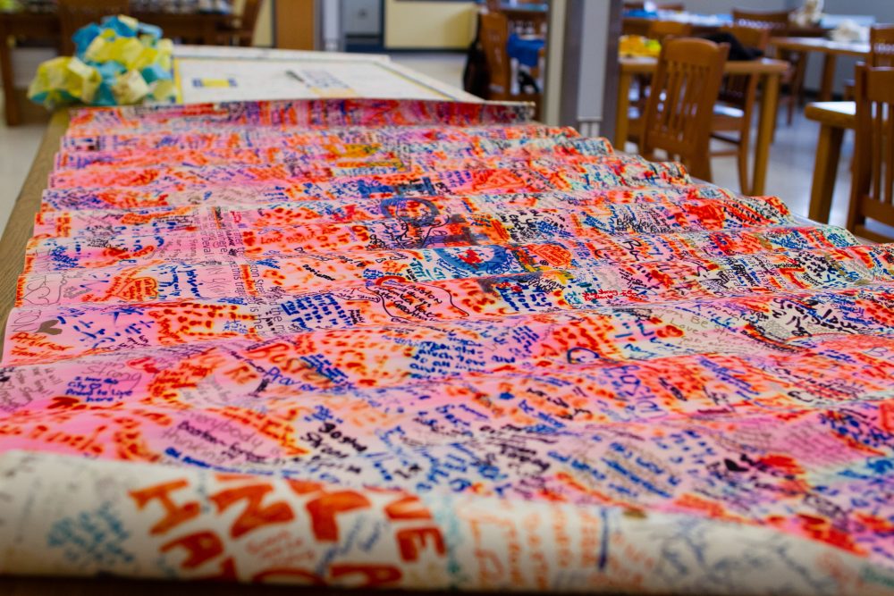 Items from a pop-up memorial following the 2013 Boston Marathon bombing are arranged on tables in the Boston City Archives reading room five years later. Photo by Elizabeth Gillis for WBUR