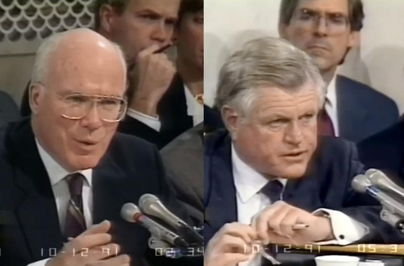 While Vermont Senator Patrick Leahy, at left, was front-and-center during the 1991 hearings investigating Supreme Court nominee Clarence Thomas, Massachusetts Senator from Ted Kennedy kept mostly quiet. Photo via screenshots from C-Span