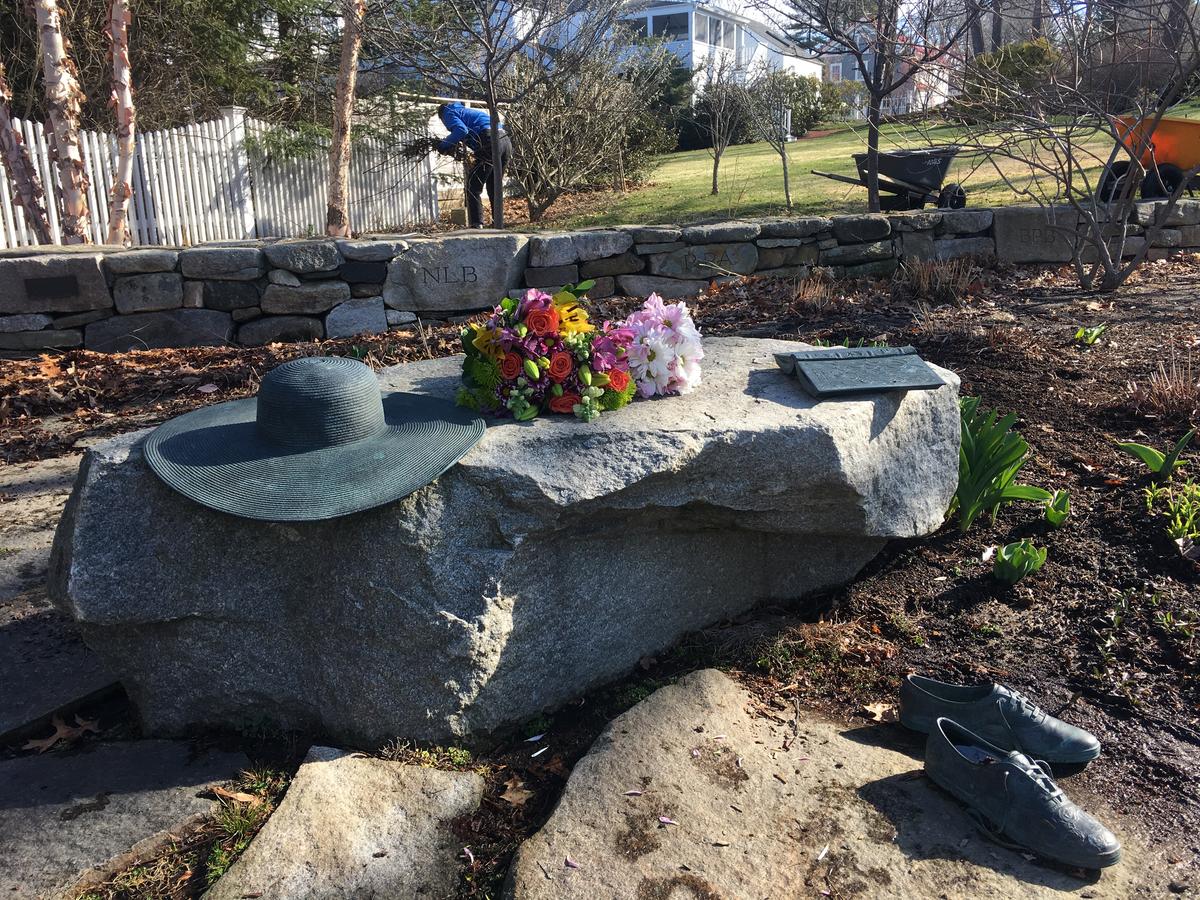 “Ganny’s Garden” by the Kennebunkport Conservation Trust. Statuary is of her hat, her favorite book, Pride and Prejudice, and her Keds, which gardener Elizabeth Spahr says were always mismatched. Photo by Fred Bever for Maine Public