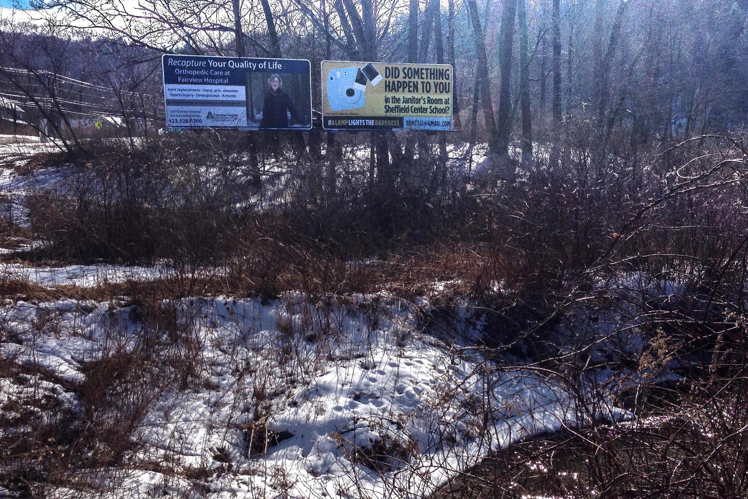 A billboard, at right, on Route 7 in Great Barrington, Massachusetts, was paid for by the mother of a man who says he was sexually abused decades ago in a now-closed elementary school in Sheffield. This one went up in February. Photo by Nancy Eve Cohen for NEPR
