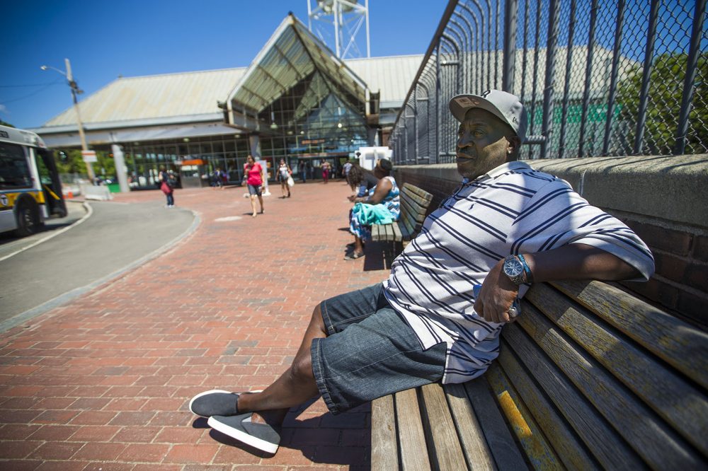 Clarence, 53, seen here by the Forest Hills MBTA station, says he’s been addicted to heroin for 30 years. Photo by Jesse Costa for WBUR
