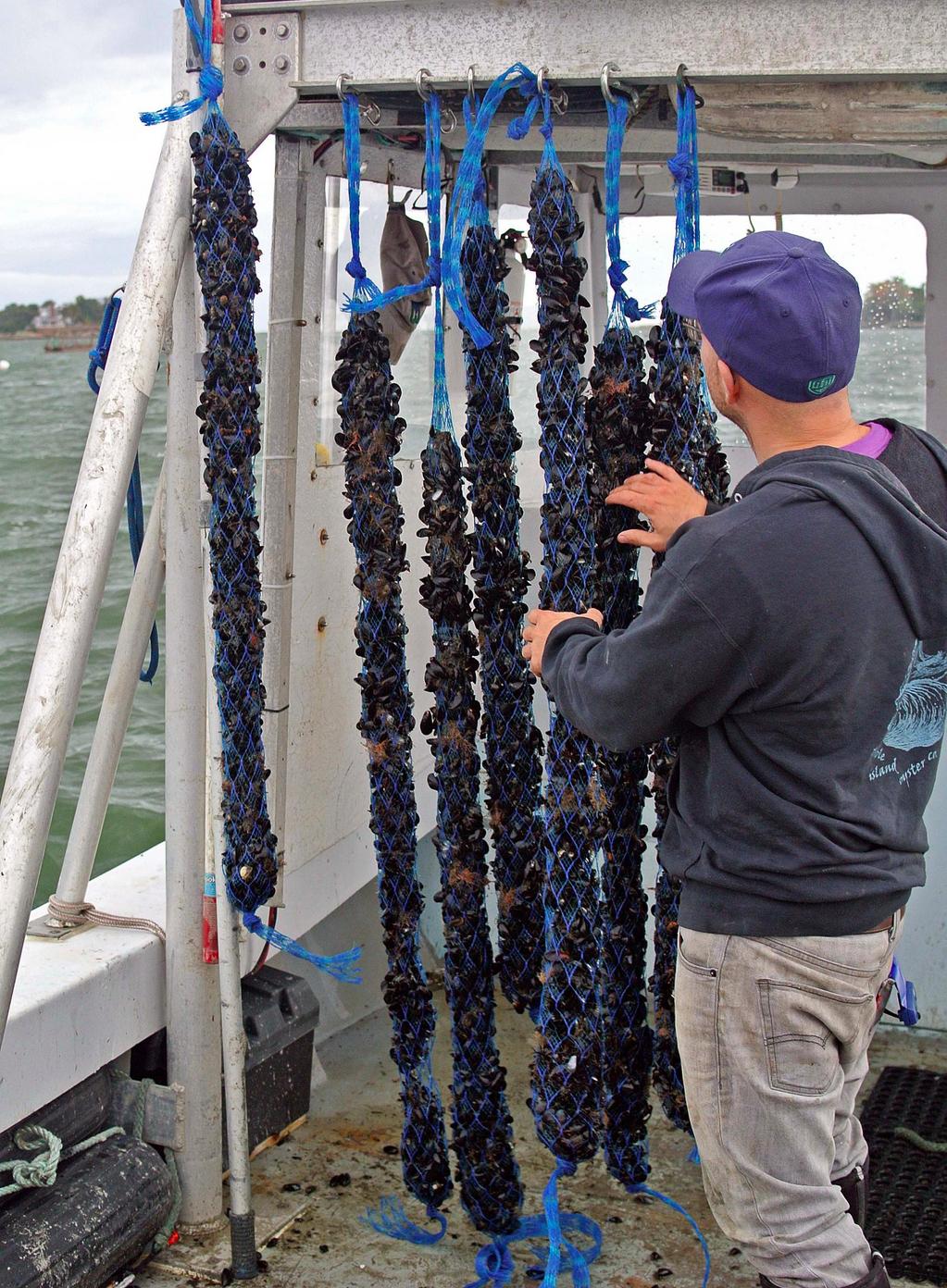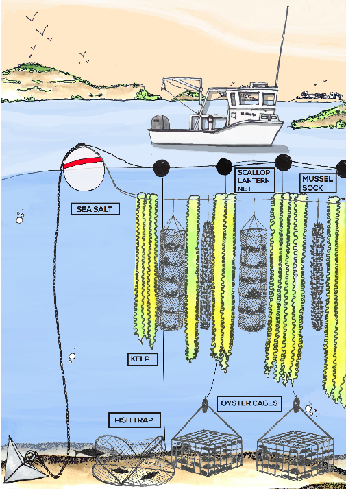 So we call it restorative ocean farming. And imagine an underwater garden where you’ve got anchors down the bottom and then just buoys up to the surface. And then horizontal lines about eight feet below the surface and from there we grow our kelp vertically downwards. We attach mussels and something we call mussel socks, scallops, and lantern nets. And then my farm, I’ve got oyster cages sitting on the sea floor and then clams down in the mud. And this sea basket approach of growing year round, different species that diversifies risk for the farmer.