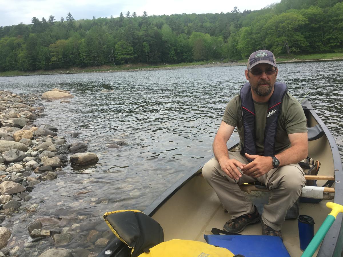 Greg Caruso, ferryman for the Appalachian Trail. In season, he takes through-hikers across the Kennebec River, a few miles downstream from where CMP wants to build a major transmission line. He opposes the plan – even with CMP’s offer to donate land and money in compensation. Photo by Fred Bever for Maine Public