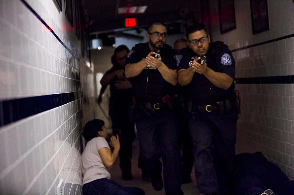En el centro de entrenamiento federal del orden público de Brunswick, Georgia, EE. UU., los funcionarios en entrenamiento de Aduana y Protección de Frontera, efectúan un simulacro de cruce de frontera. (Jesse Costa/WBUR)