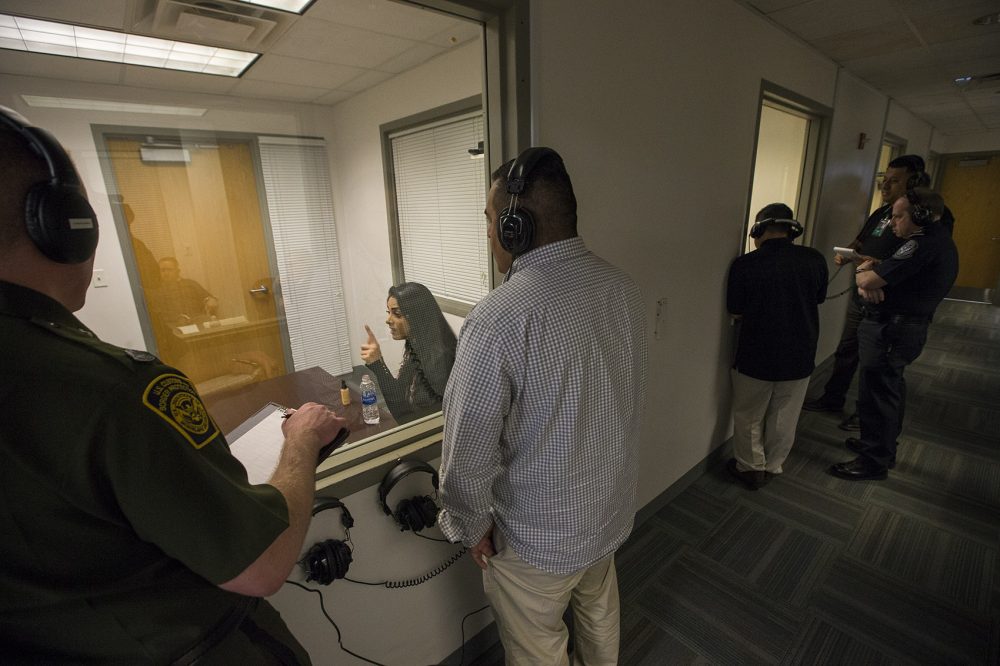 Funcionarios en entrenamiento de la CBP participan en un entrenamiento avanzado de interrogatorio secundario. (Jesse Costa/WBUR)