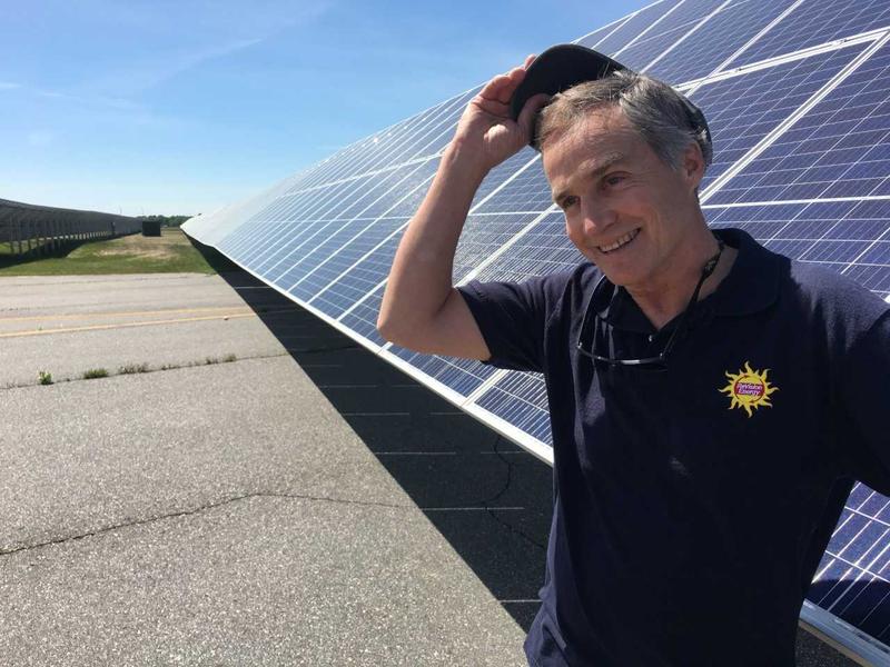 Steve Hinchman of ReVision Energy at the 1.5 megawatt solar plant the company installed at Brunswick Landing. Photo by Fred Bever for Maine Public