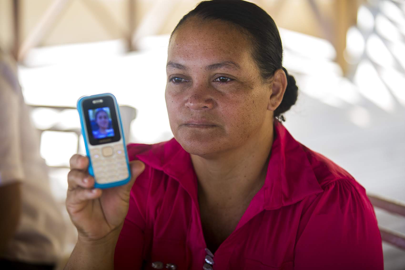 Rosa Lina Linder shows a photograph of her 16-year-old daughter on her cellphone, still being detained in the U.S. Photo by Jesse Costa for WBUR