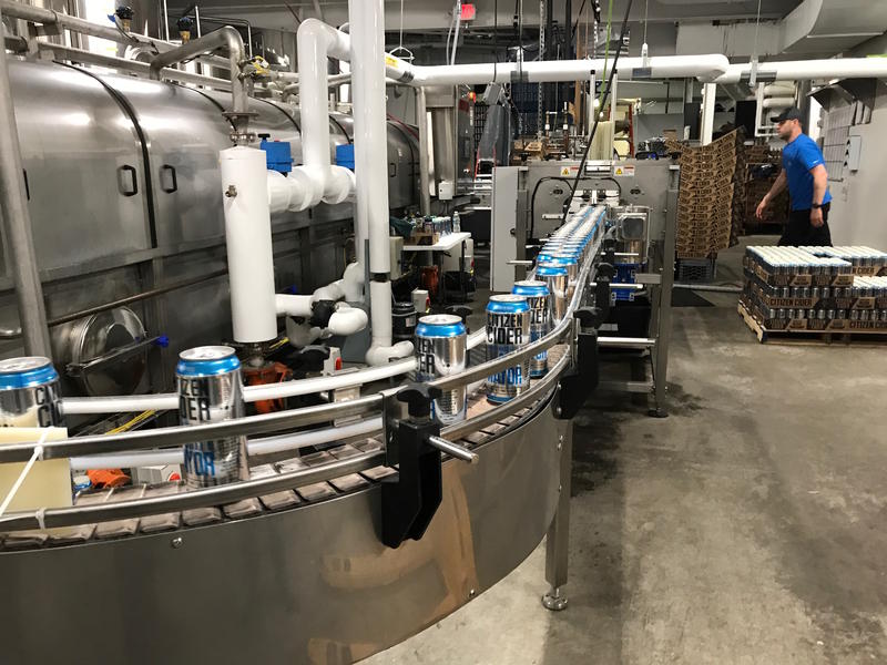 Aluminum cans of Citizen Cider’s “Dirty Mayor” make their way on the canning belt at the company’s Burlington canning facility. A new tariff on some imported steel and aluminum has Vermont craft brewers and cider makers bracing for uncertainty. Photo by Henry Epp for VPR