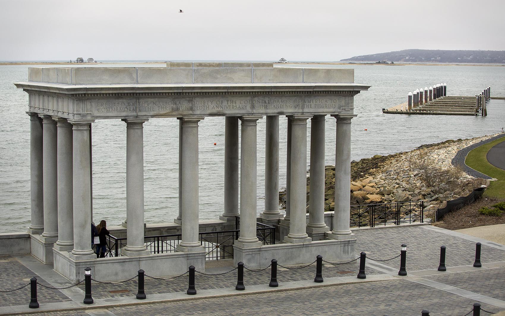 The Plymouth Rock portico looks out across the Plymouth Bay to Rocky Point, the location of Pilgrim Nuclear Power Station. Photo by Robin Lubbock for WBUR
