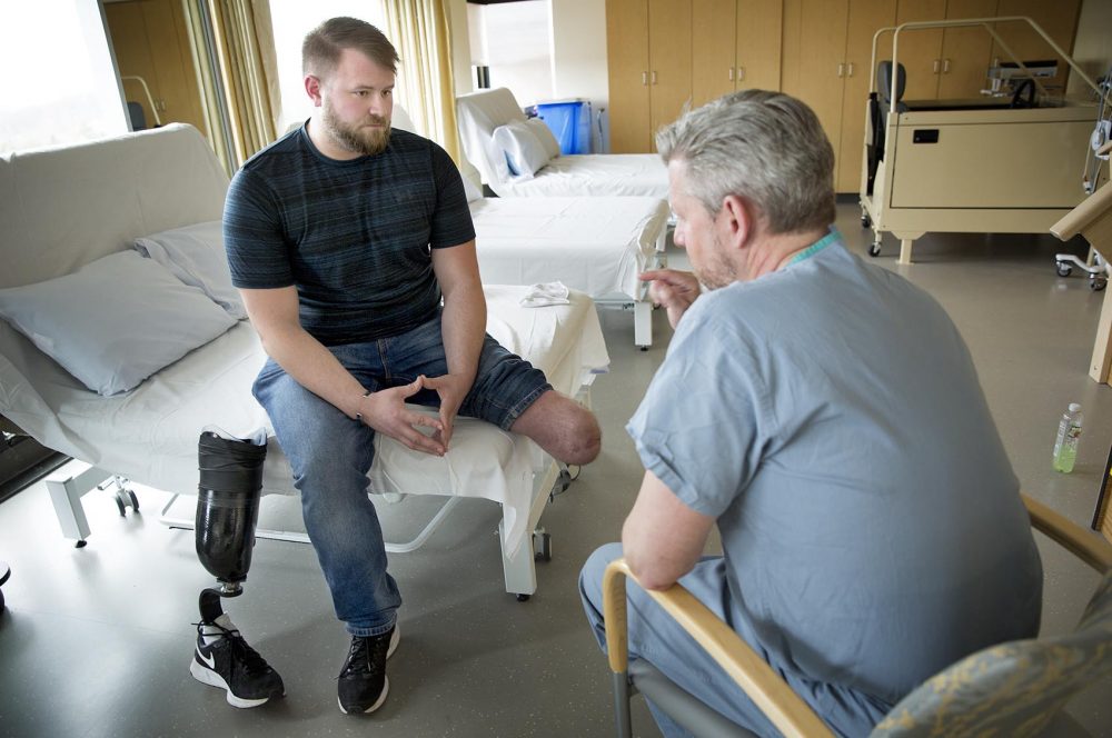 Brandon Korona, an Army veteran whose left leg was injured in an IED explosion in Afghanistan, talks with Dr. Matthew Carty at Brigham and Women’s Faulkner Hospital in Boston. Photo by Robin Lubbock for WBUR