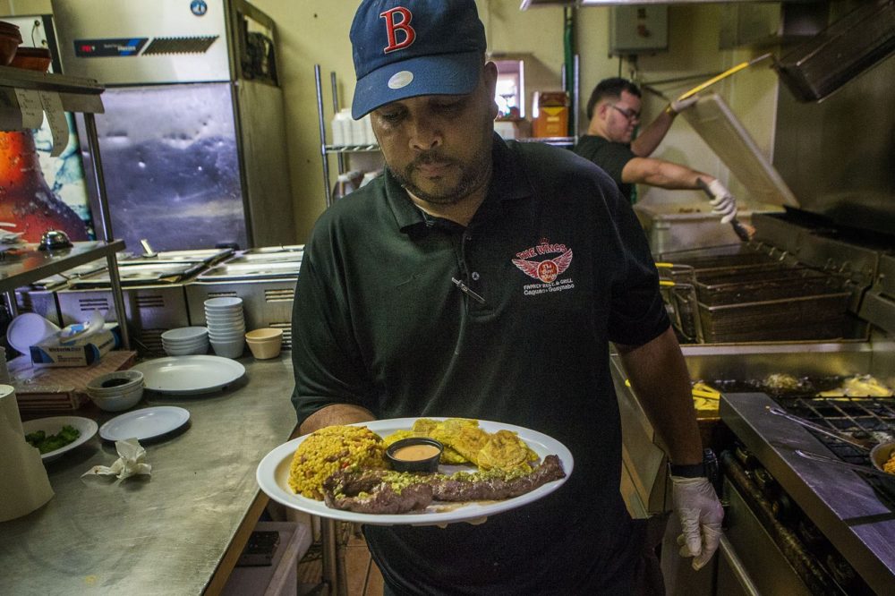 Churrasco con arroz mamposteao from The Wings Restaurant, Red Sox manager Alex Cora’s favorite dish when he comes home to Caguas. Photo by Jesse Costa for WBUR