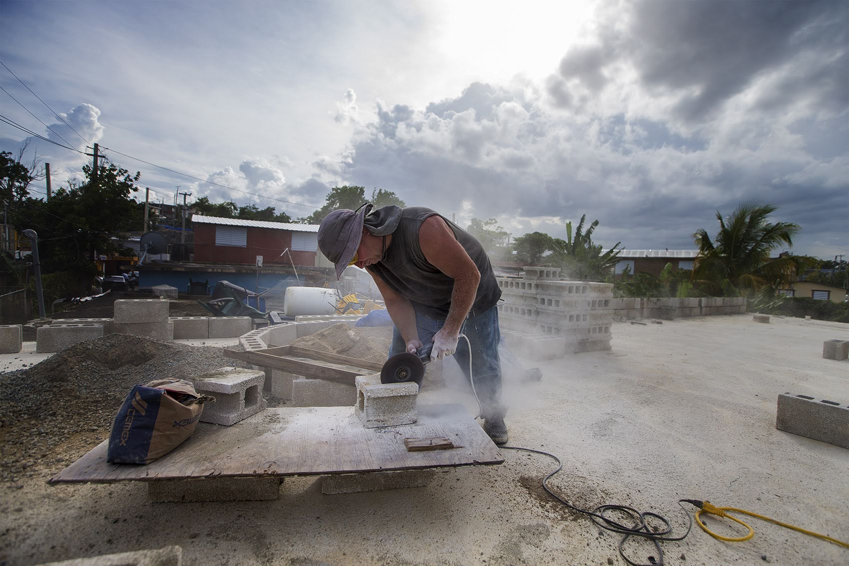 Jose Contreras saws a concrete block in half as he rebuilds his house in Barrio-Bravos de Boston, San Juan, which was completely destroyed by Hurricane Maria a year ago . Photo by Jesse Costa for WBUR