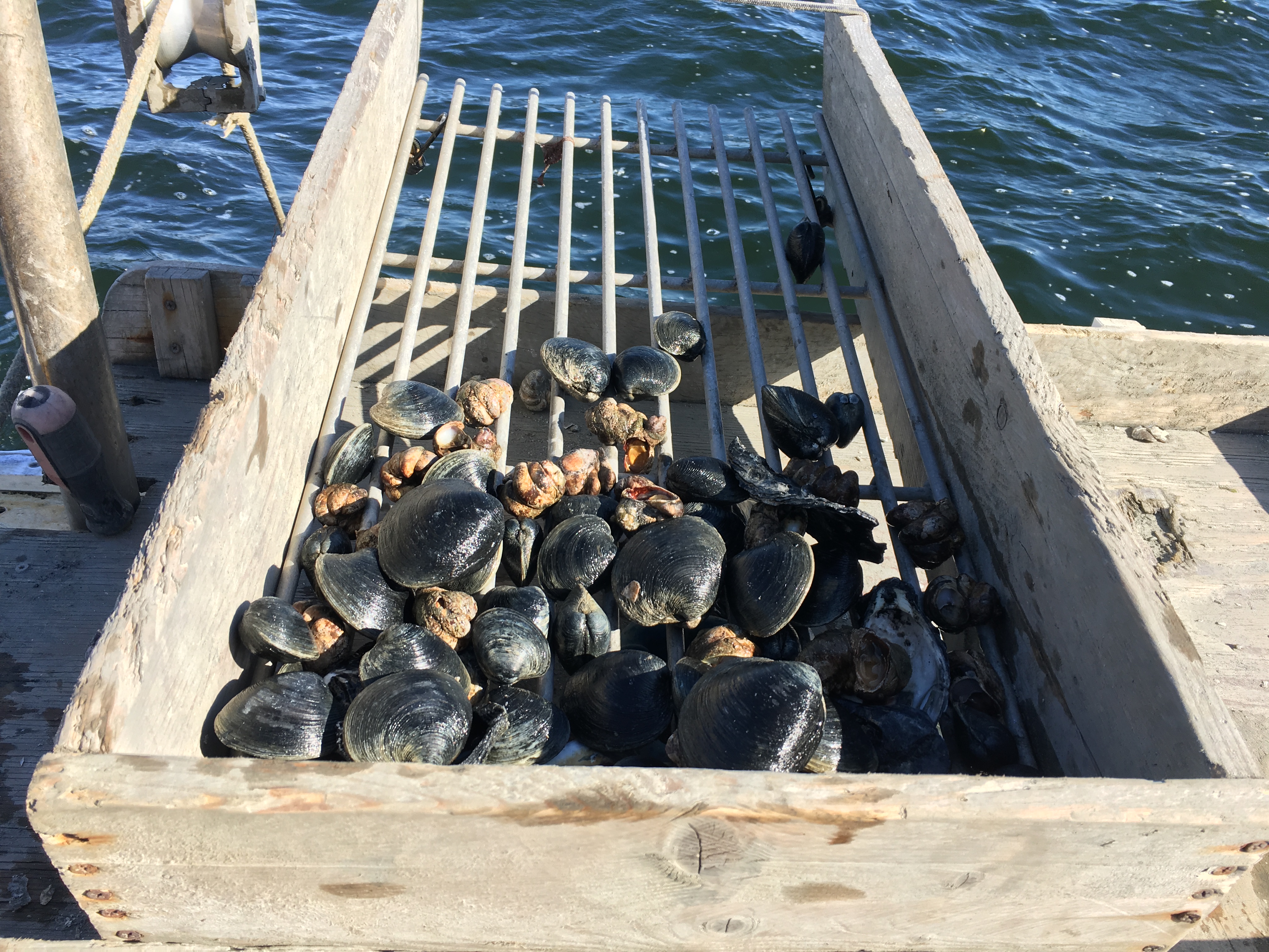 This rack sorts the clams, and fishermen toss back any that are small enough to fall between the cracks. Photo by Sofia Rudin for The Public’s Radio