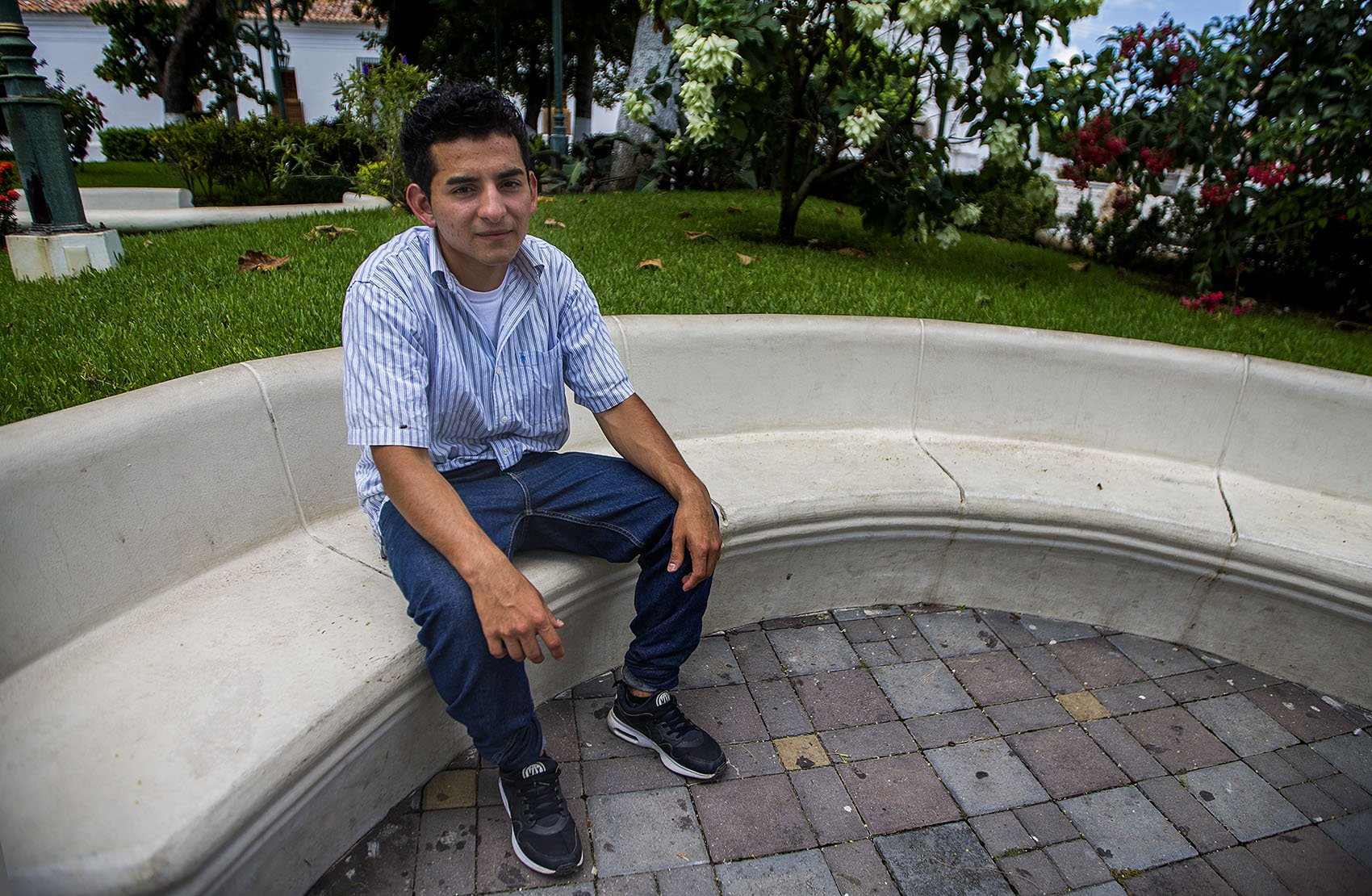 - Orlando sits in a plaza in Metapán, El Salvador. Photo by Jesse Costa for WBUR