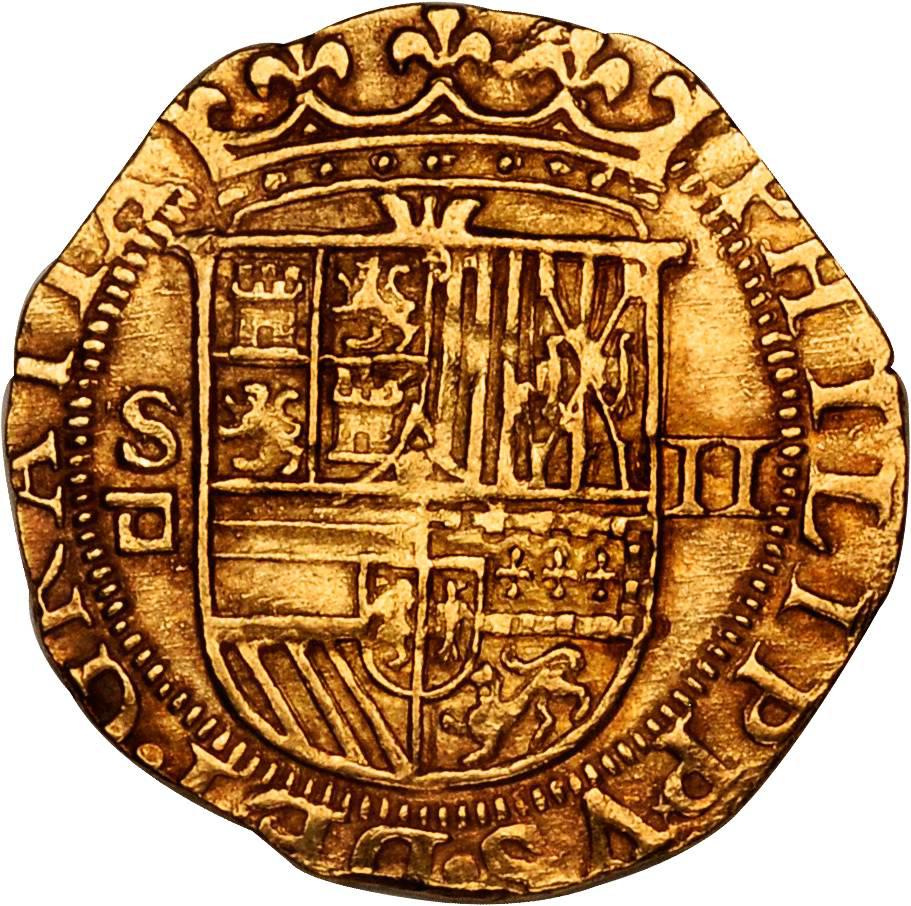 The front of a Two Escudos coin, or doubloon, minted in Seville, Spain between 1556 and 1598. Sold at auction in 2010 for $1,770. Courtesy Stack’s Bowers Galleries