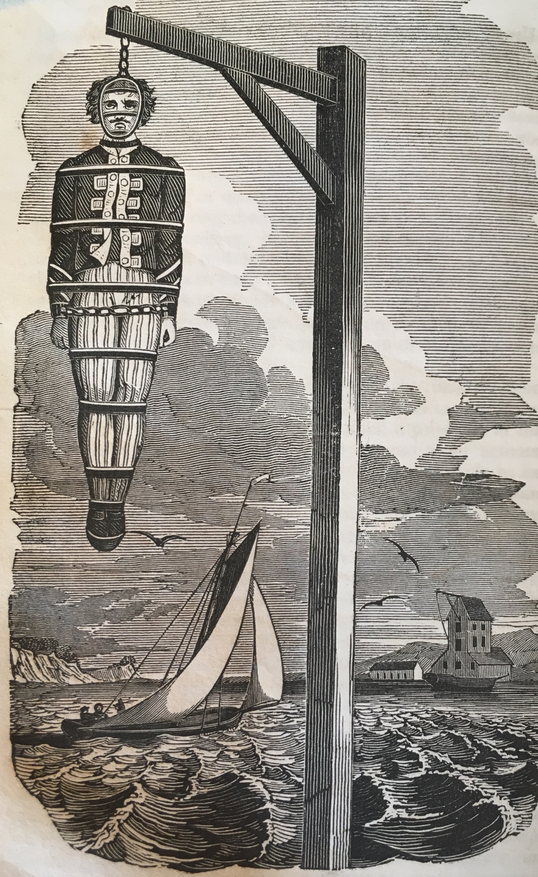 Captain William Kidd hung in an iron cage at Tilbury Point (1837 engraving). By Charles Ellms from The Pirates Own Book, or Authentic Narratives of the Lives, Exploits, and Executions of the Most Celebrated Sea Robbers. Courtesy Houghton Library, Harvard University.