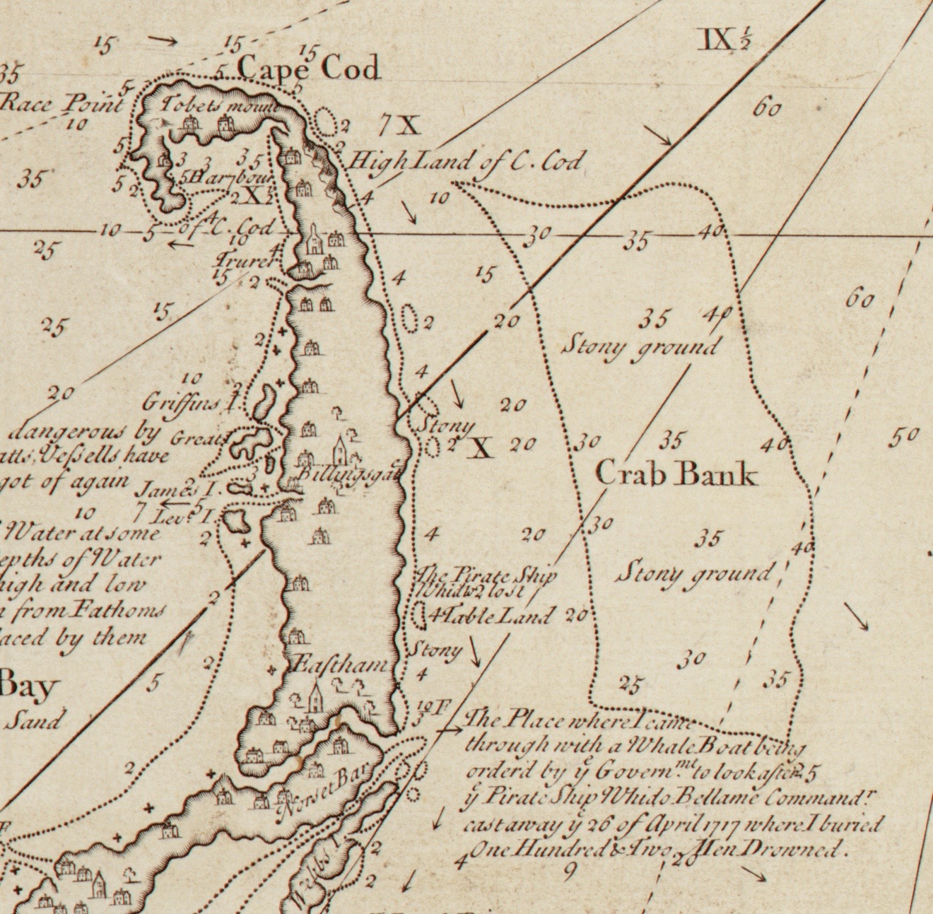 Detail of Cyprian Southack’s map of Massachusetts, circa 1734. A thick arrow (not original to the map) points to where Southack wrote “The Pirate Ship Whidah Lost.” Below that to the right is more text in which Southack informs the reader that he buried 102 men from the wreck who had drowned. Courtesy of Library of Congress, Geography and Map Division