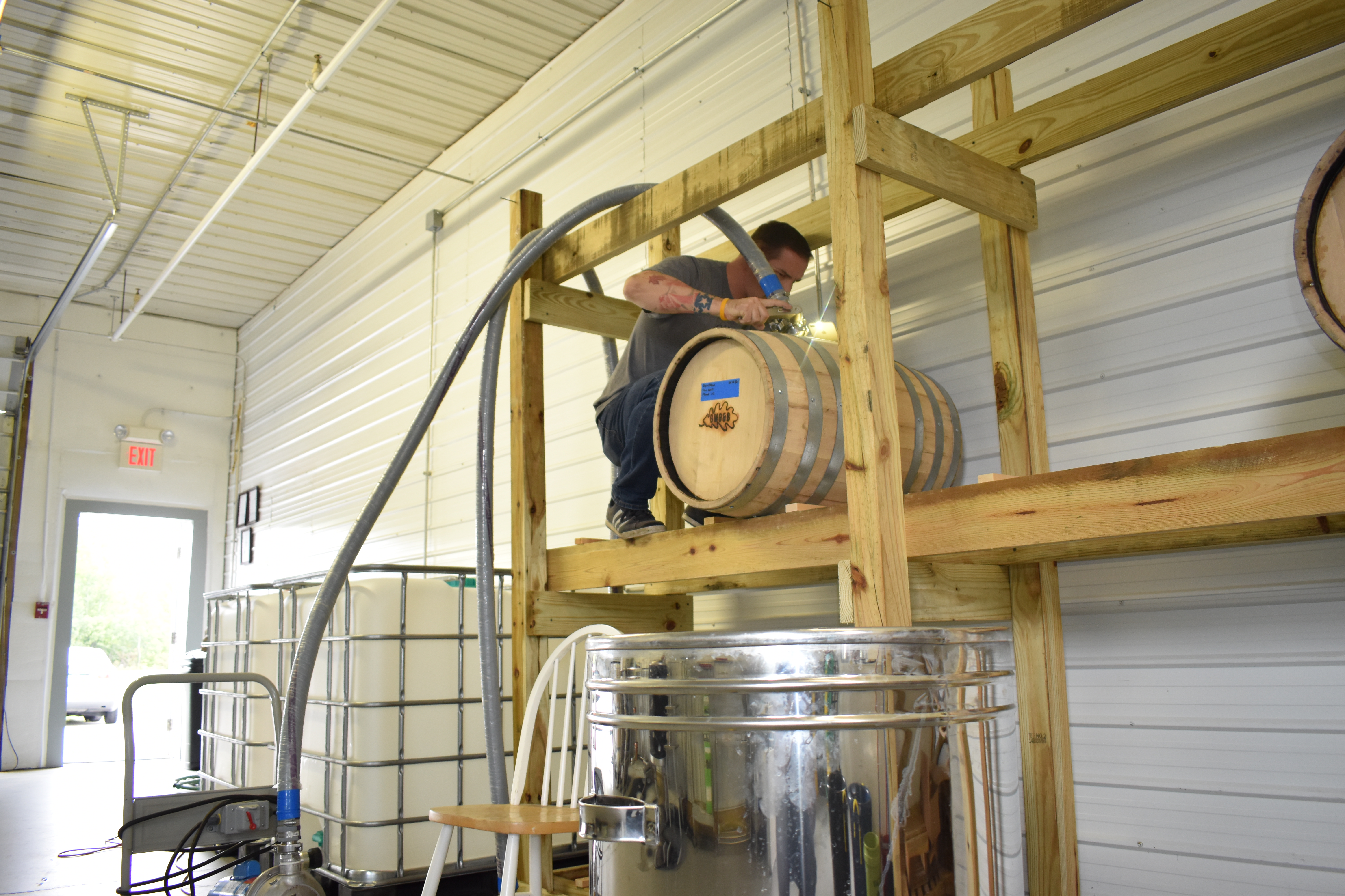 In an industrial garage in Saint Albans, Steve Gagner uses an electric pump to transfer clear, strong-smelling liquid from a tank to a white-oak barrel.