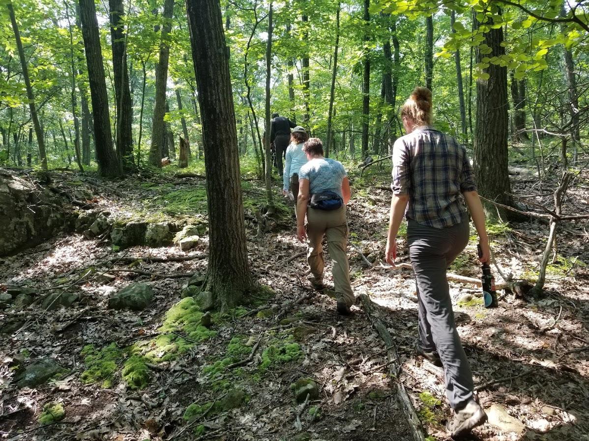 Activists from the group Protect Our Watersheds CT hike through part of the area where Tilcon is proposing to expand its nearby trap rock quarry. Photo by Patrick Skahill for Connecticut Public Radio