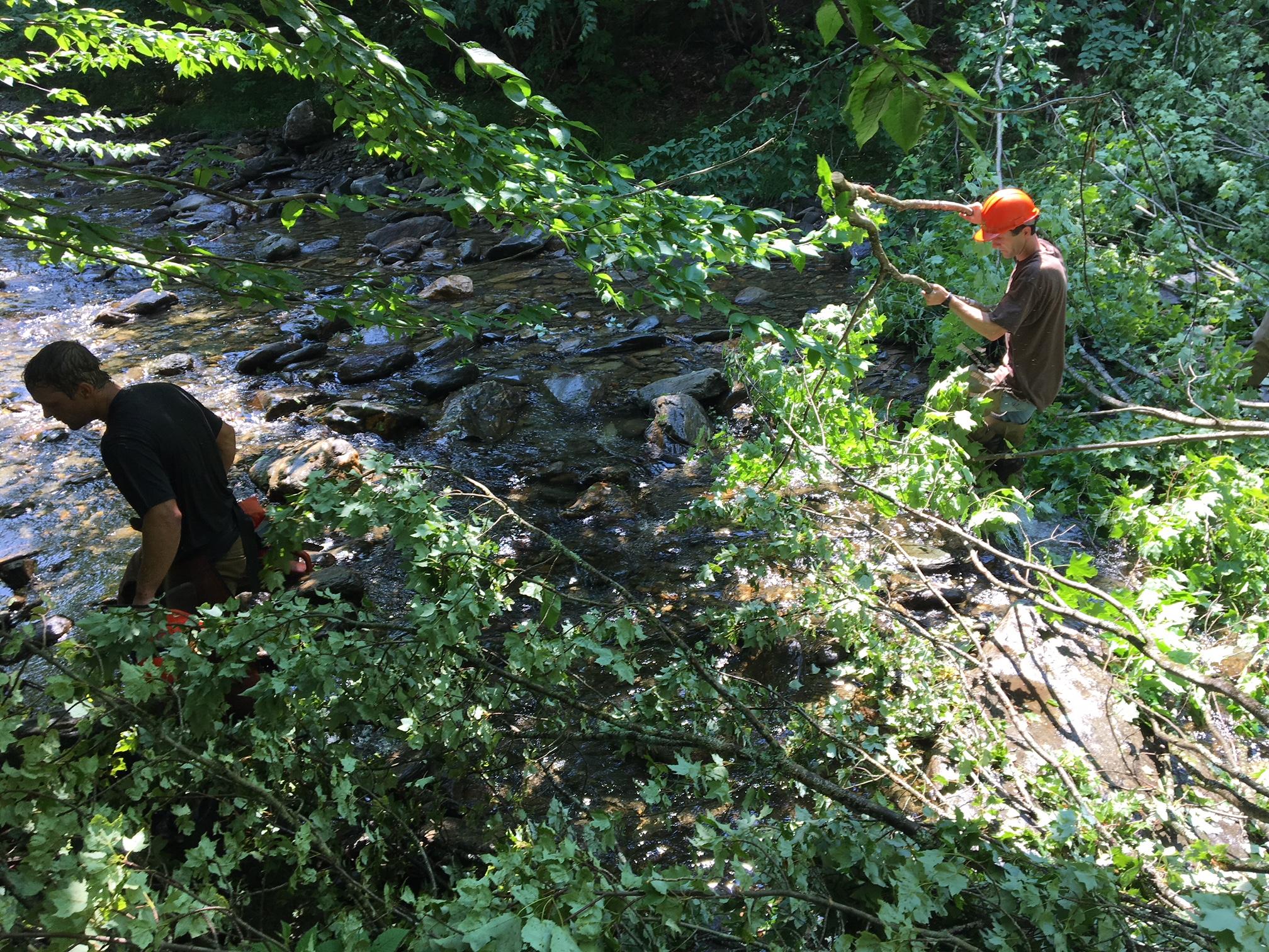 To improve habitat on Calavale Brook, first, you have to drop some trees in the stream. Photo by John Dillon for VPR