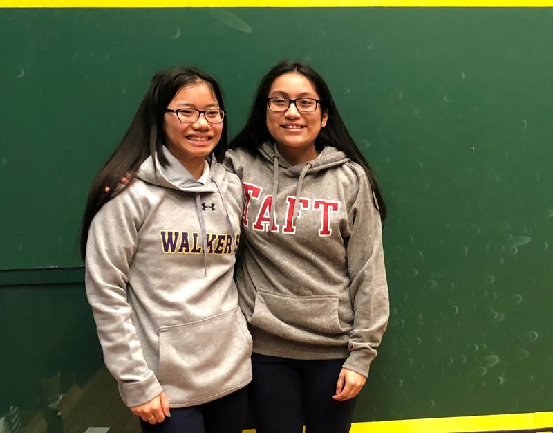 Hartford teens Ku Paw, left, and Julissa Mota celebrates after getting accepted to Connecticut boarding schools. Opportunities came after they began playing squash a few years ago through the Capitol Squash program hosted at Trinity College in Hartford. Photo by Vanessa de la Torre for Connecticut Public Radio