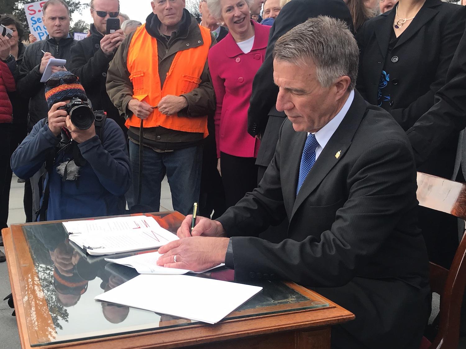 Gov. Phil Scott signs three pieces of gun control legislation amid boos and cheers on the front steps of the statehouse Wednesday, April 11, 2018. Photo by Emily Alfin Johnson for VPR.