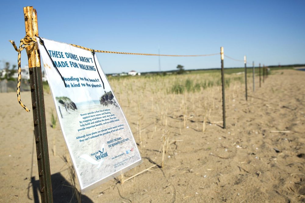 Photo at the top of the page: An area of recently planted beach grass on Plum Island is roped off for its protection. Photo by Robin Lubbock for WBUR