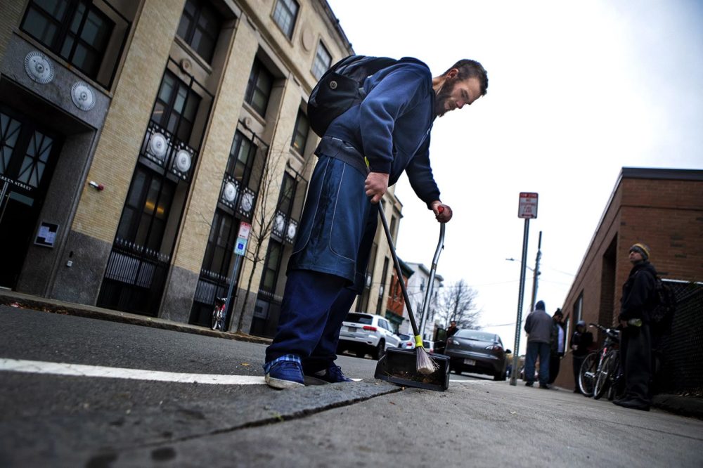 Photo at the top of the page: Michael sweeping up cigarettes and other debris from the sidewalk outside the ACC Needle Exchange in Central Square in Cambridge. Photo by Jesse Costa for WBUR