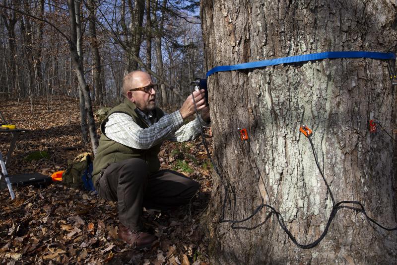 Forest pathologist Bob Marra demonstrates equipment used to internally scan trees. “If we’re going to look to forests as a way to sequester carbon, we should develop much more accurate estimates of how much carbon is actually sequestered,” Marra said. Photo by Patrick Skahill for Connecticut Public Radio