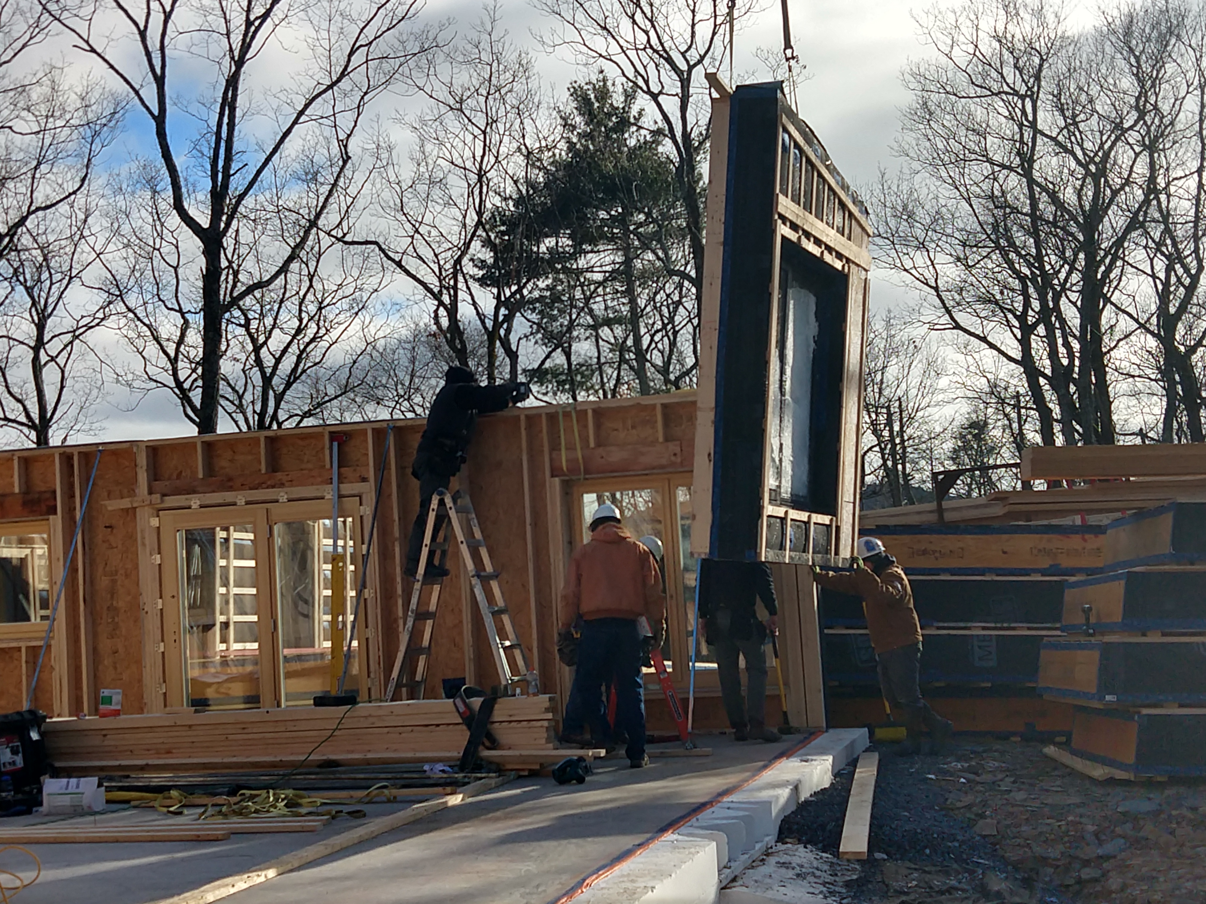 A wall section is lowered by a crane on to the foundation of a “passive house” manufactured by the Maine company Ecocor. Photo by Jon Kalish for NEXT