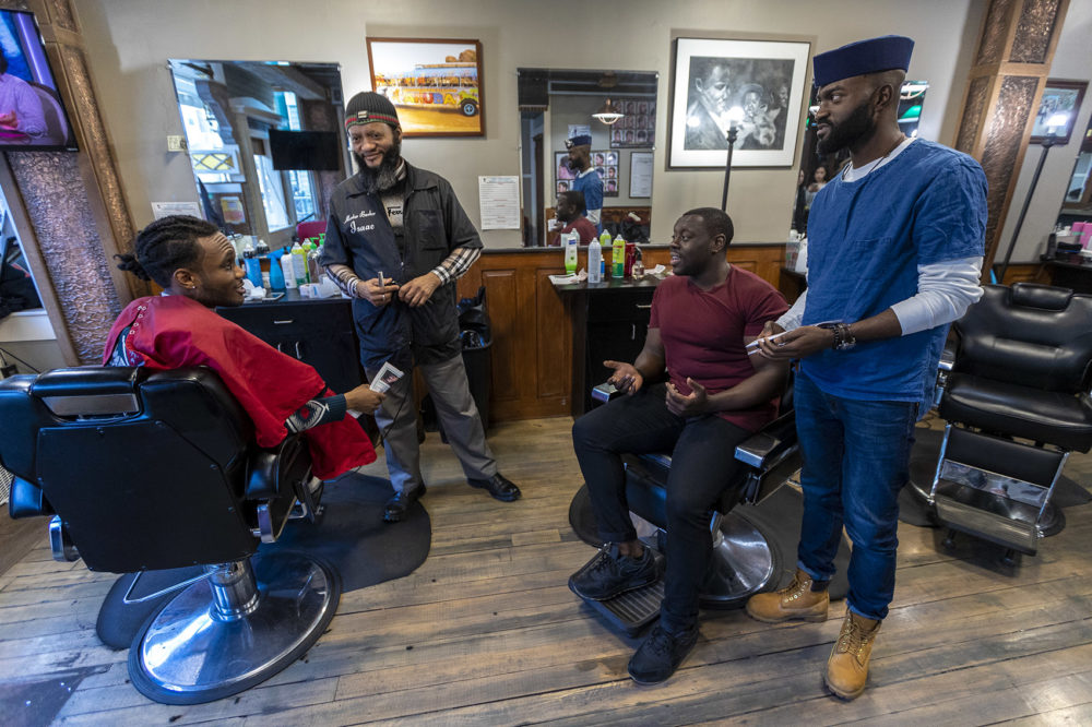 From right to left: Bright Genty and his father, master barber Isaac, speak with “Barber Shop Chronicles” actor Ekow Quartey and the production’s writer Inua Ellams at Headlines Unisex Barbershop in Cambridge. Photo by Jesse Costa for WBUR