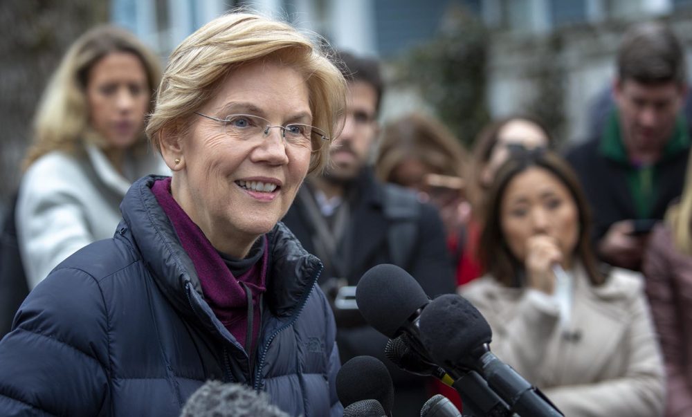 Massachusetts Senator Elizabeth Warren talks with reporters outside her home in Cambridge, Massachusetts after announcing that she is setting up an exploratory committee for a run for the presidency in 2020. Photo by Robin Lubbock for WBUR