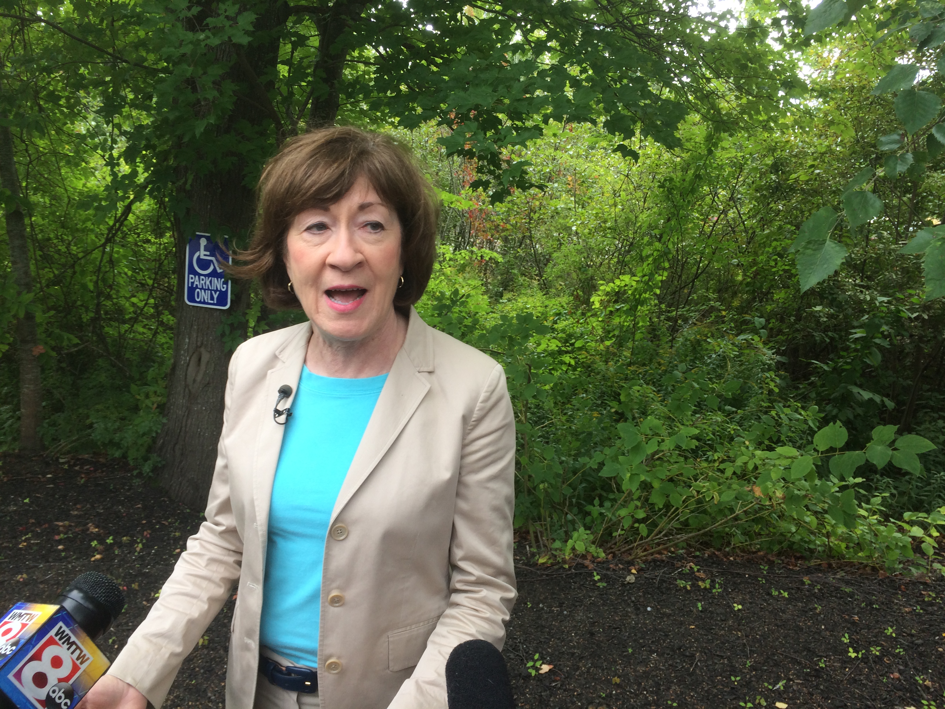 Collins speaks to the media about Brett Kavanaugh during a stop at The Cedars retirement community in Portland for a groundbreaking ceremony in September. Photo by Willis Ryder Arnold for Maine Public