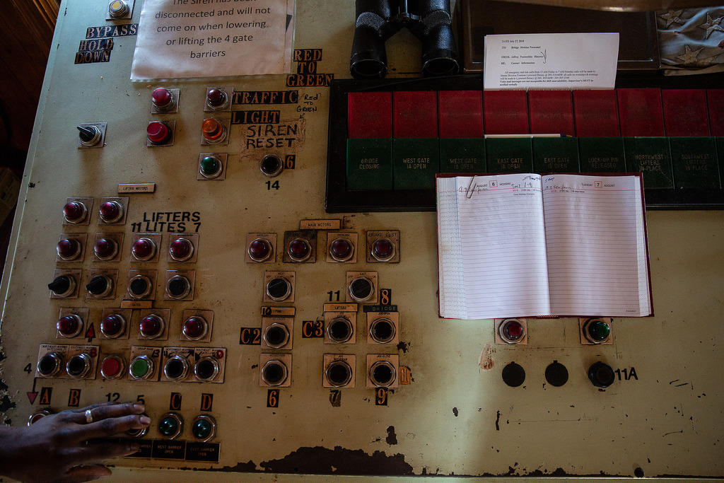 Photo at the top of the page: Bridge Tender Mike Dorsey runs through the controls of the Grand Avenue Swing Bridge in New Haven. “People don’t usually look up here,” Dorsey said. “They just ride right through not even knowing that we’re up here.” Photo by Ryan Caron King for Connecticut Public Radio