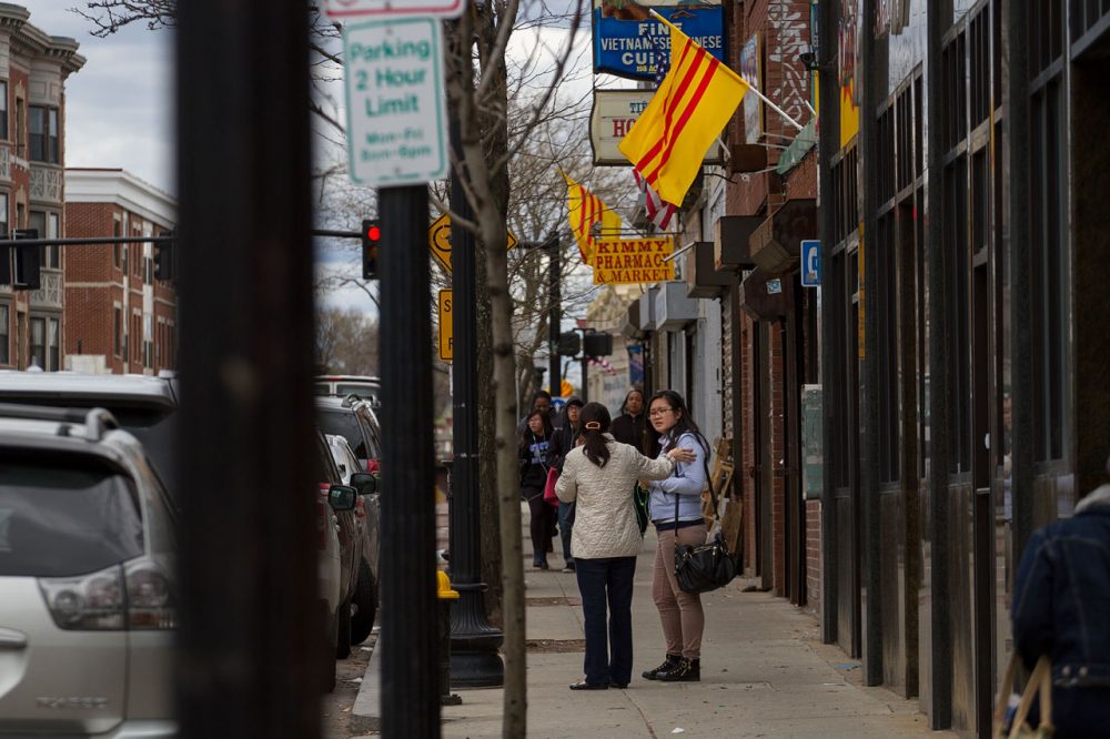 South Vietnamese flags fly over businesses down Boston’s Dorchester Avenue ahead of the 40th anniversary of the fall of Saigon in 2015. Photo by Jesse Costa for WBUR