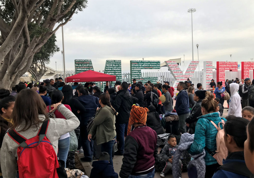 Families wait at “El Chaparral,” a border crossing near San Ysidro, California, to hear which names are called from the asylum waitlist. Photo by Shannon Dooling for WBUR