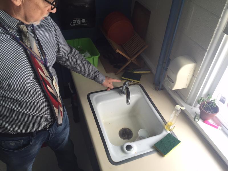 Andy Paciulli, who was Academy School principal when this photo was taken in February, points to one of the Brattleboro school’s fixtures that was replaced after state tests discovered lead was leaching into the water. Photo by Howard Weiss-Tisman for VPR