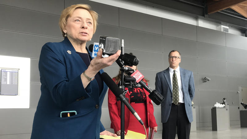 Gov. Janet Mills holds up a pound of carbon at a press conference at the Portland Jetport on Thursday. Photo by Fred Bever for Maine Public