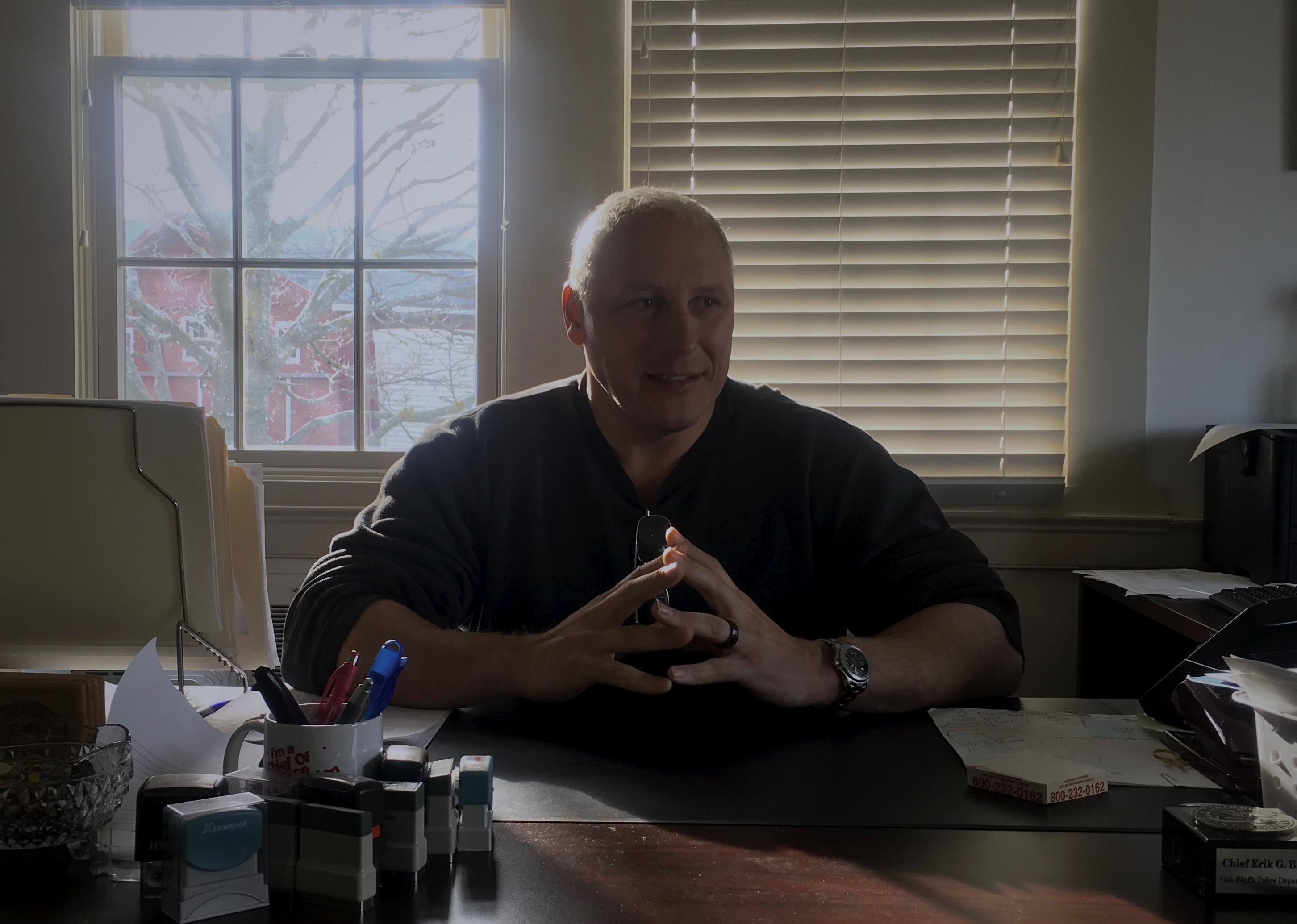 Oak Bluffs Police Chief Erik Blake sits at his desk. November 2018. Oak Bluffs, MA. Photo by James Albert Sneed