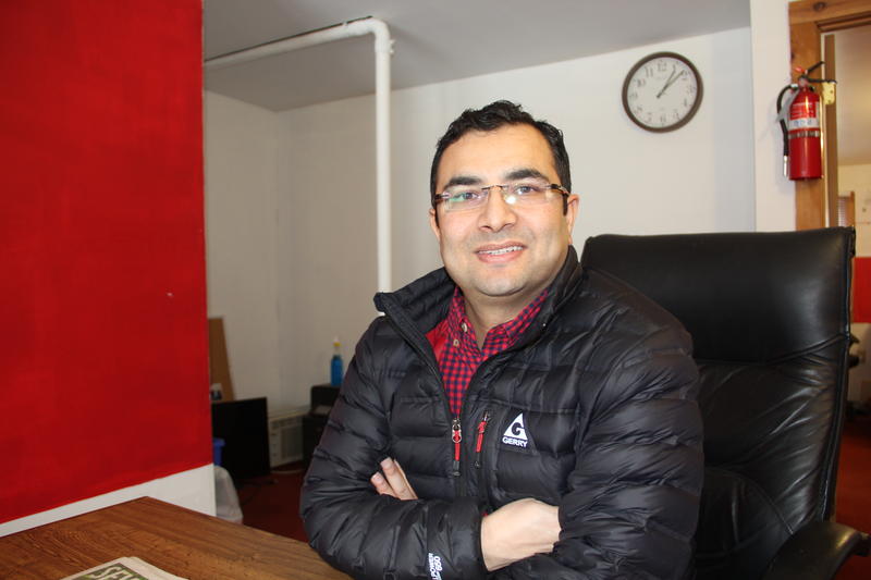 Bhuwan Sharma, co-owner of Burlington Employment Agency, at his Old North End office. He said his business has plateaued due in large part to Bhutanese-Nepali refugees moving from Vermont to Columbus, Ohio. Photo by Bayla Metzger for VPR