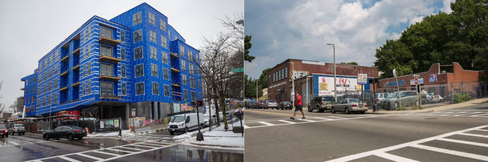 3200 Washington St. in Egleston Square in Boston, today, left, and back in 2015. Photo by Jesse Costa for WBUR