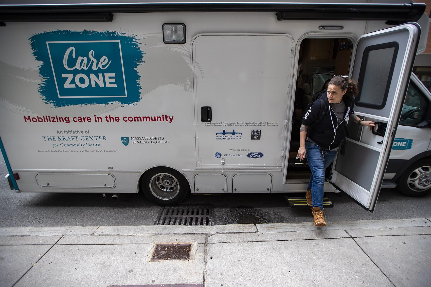 Sarah Mackin exits the Care Zone van after it parks on Haverhill St. near by North Station. They will mobilize and walk around the area to look for opioid users who need assistance. Photo by Jesse Costa for WBUR