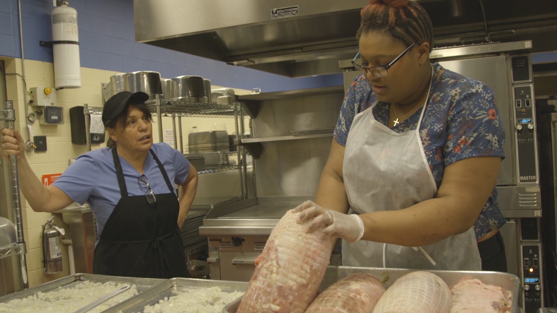 Cafeteria staff works overtime cooking raw turkeys. Photo courtesy of Fiona Turner from the new documentary, “Eat Up”