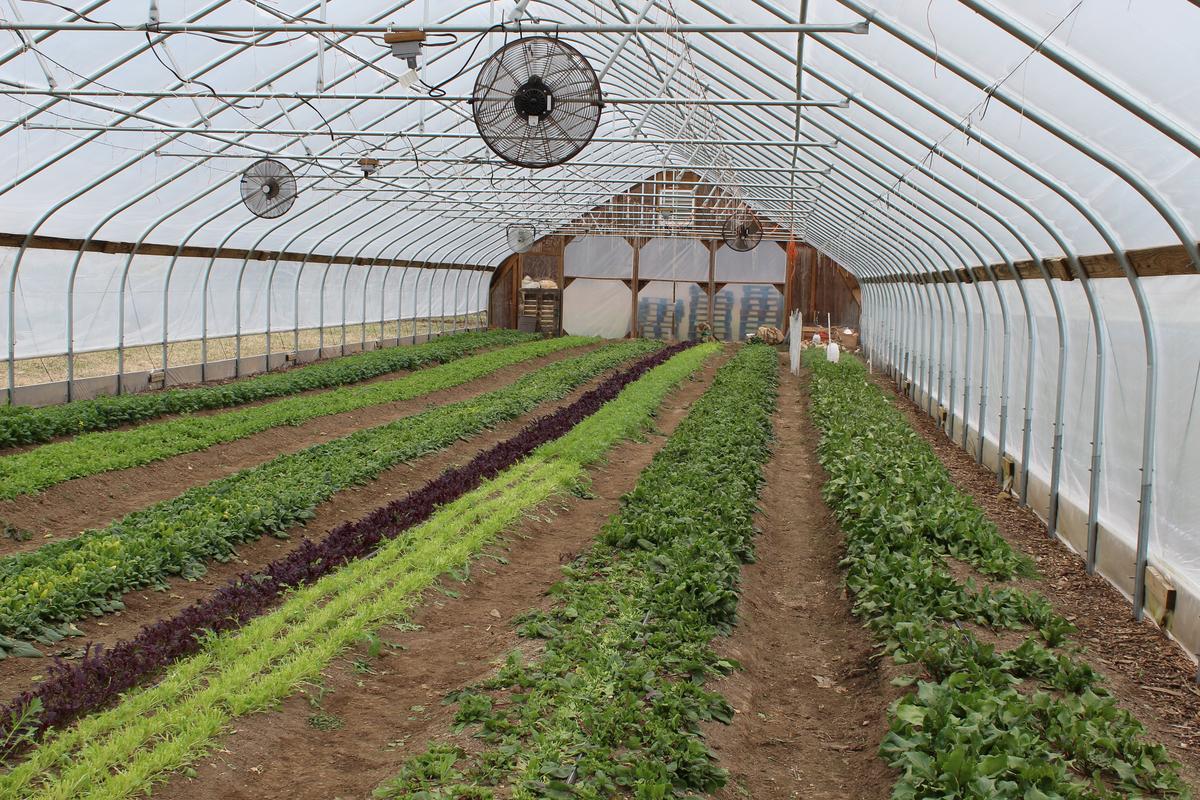 Spinach and other leafy greens are grown inside a hoop house, a structure similar to a greenhouse that enables farmers to extend the growing season in northern climates. Photo by Cassandra Basler for WSHU