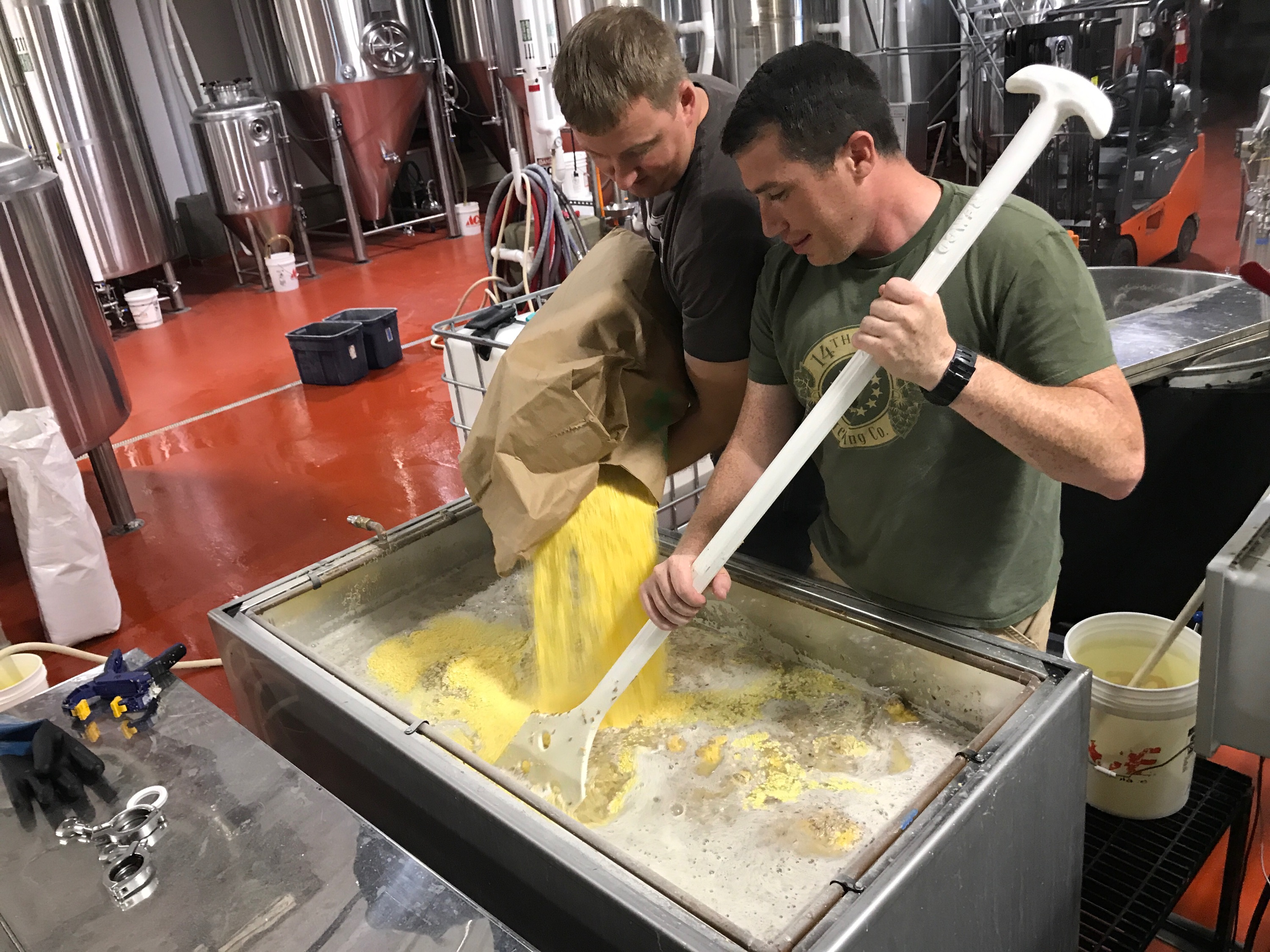 Zac Fike (L) and Matt Kehaya (R) work on a batch of beer at 14th Star Brewing Company. 14th Star donates proceeds from every batch to local nonprofits. Courtesy of Danger Close Craft Distilling