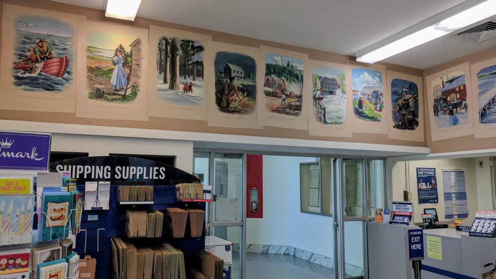 Last year, NHPR’s Jason Moon told the story about a controversial mural in the post office in Durham, NH that tells the town’s history. One mural titled “Cruel Adversity” depicts a Native American man hiding behind a bush, looking at a colonial cabin and holding a flaming torch. The New Hampshire Commission on Native American Affairs wanted the image removed, but the post office wouldn’t allow it. Another solution was proposed: an interpretive text would be displayed alongside it, providing context to the image. Jason Moon reports that the Commission says the text still isn’t enough.