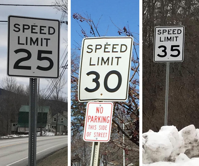 From left to right, speed limit signs in Bridgewater, South Burlington and Plymouth, Vermont. Photo by Emily Corwin and Meg Malone for VPR