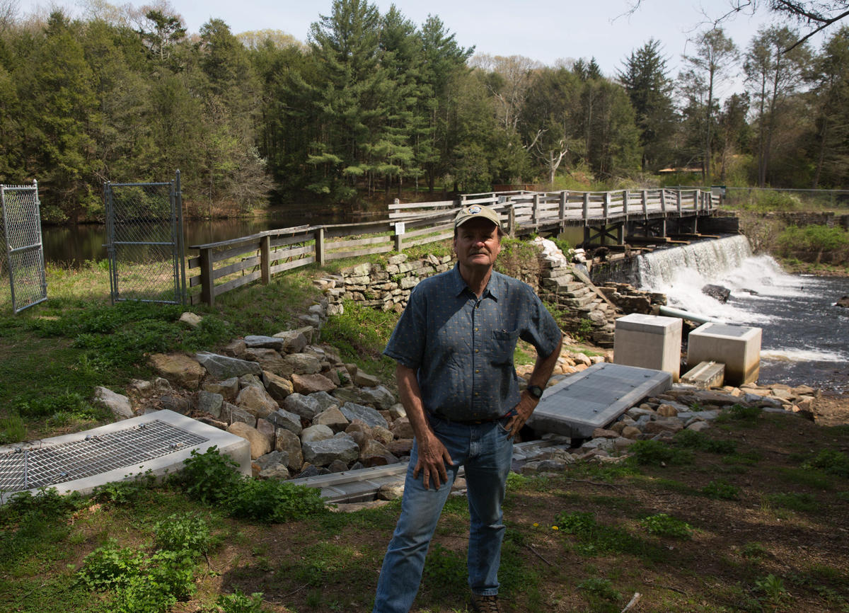 Steve Gephard, a supervising fisheries biologist with the state Department of Energy and Environmental Protection, in front of a fishway and eel pass. His agency manages on the Menunketesuck River. Photo by Patrick Skahill for Connecticut Public Radio